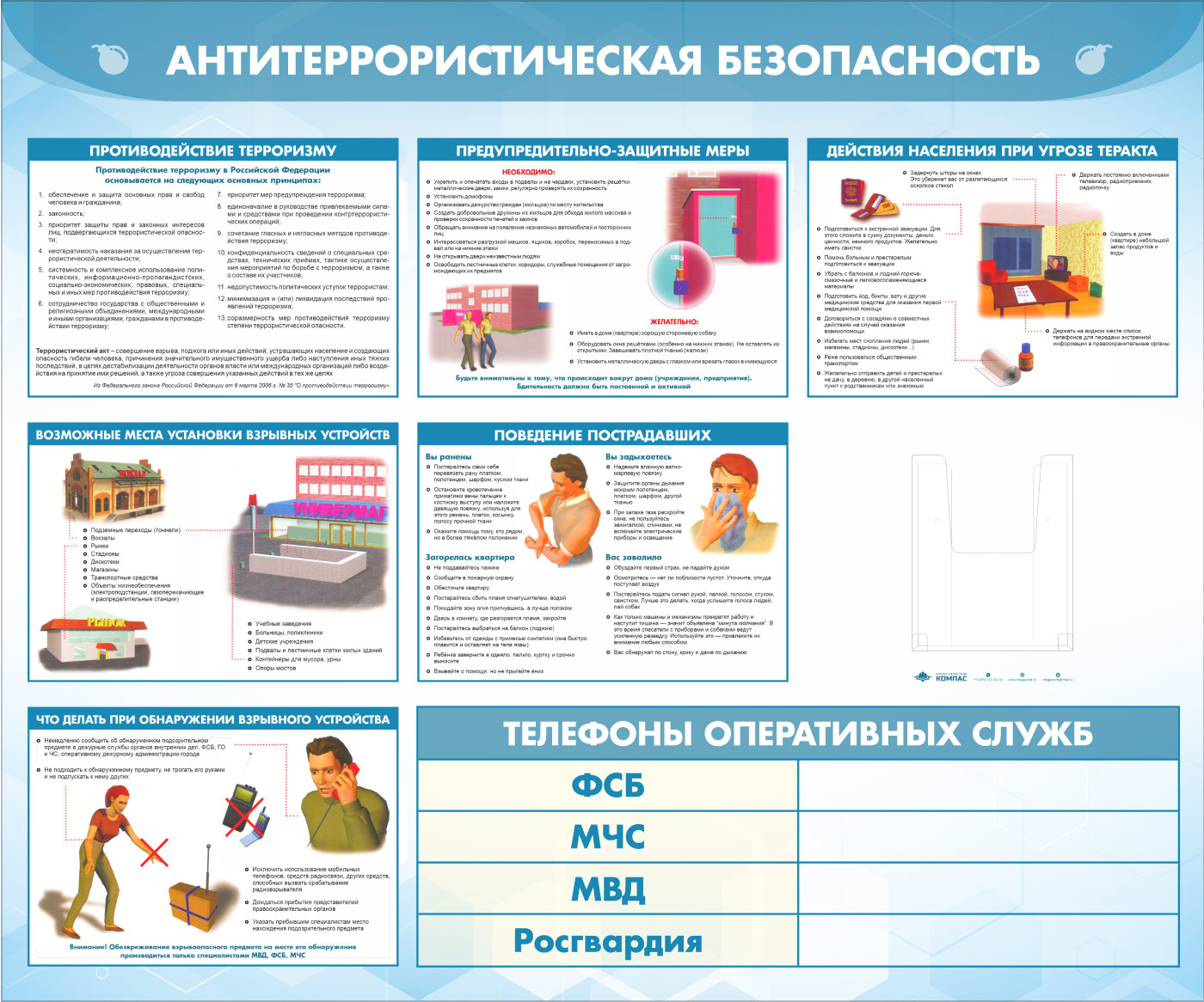 Стенд «Антитеррористическая безопасность» с глубоким А5 карманом - это важнейшая информация о необходимых действиях по выявлению готовящегося теракта и о том, как себя вести в случае террористического акта