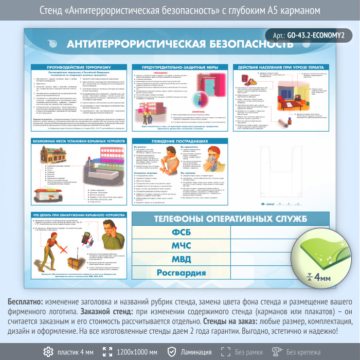 Стенд «Антитеррористическая безопасность» с глубоким А5 карманом (GO-43.2-ECONOMY2)