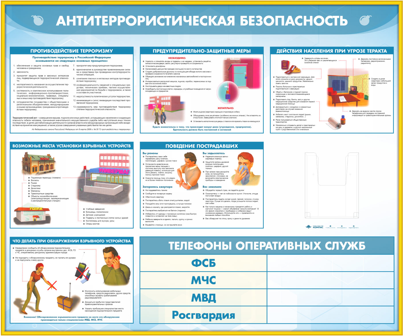 Стенд «Антитеррористическая безопасность» с глубоким А5 карманом - это важнейшая информация о необходимых действиях по выявлению готовящегося теракта и о том, как себя вести в случае террористического акта
