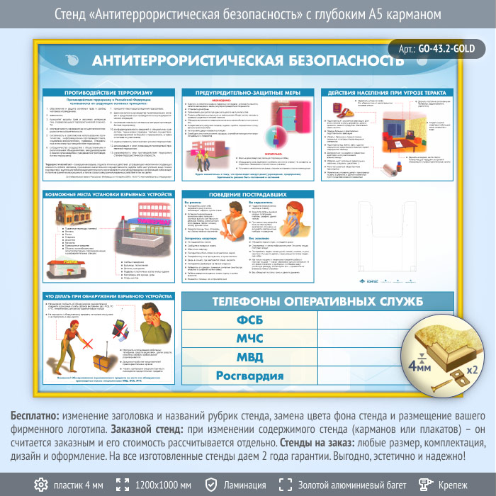 Стенд «Антитеррористическая безопасность» с глубоким А5 карманом (GO-43.2-GOLD)