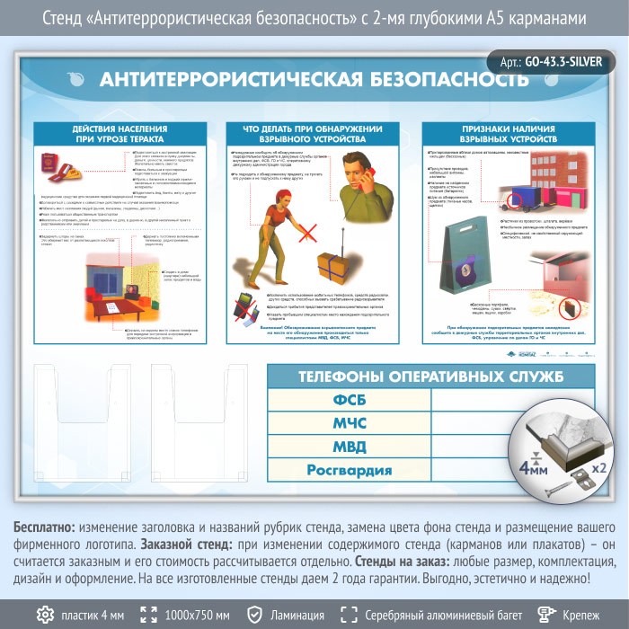 Стенд «Антитеррористическая безопасность» с 2-мя глубокими А5 карманами (GO-43.3-SILVER)