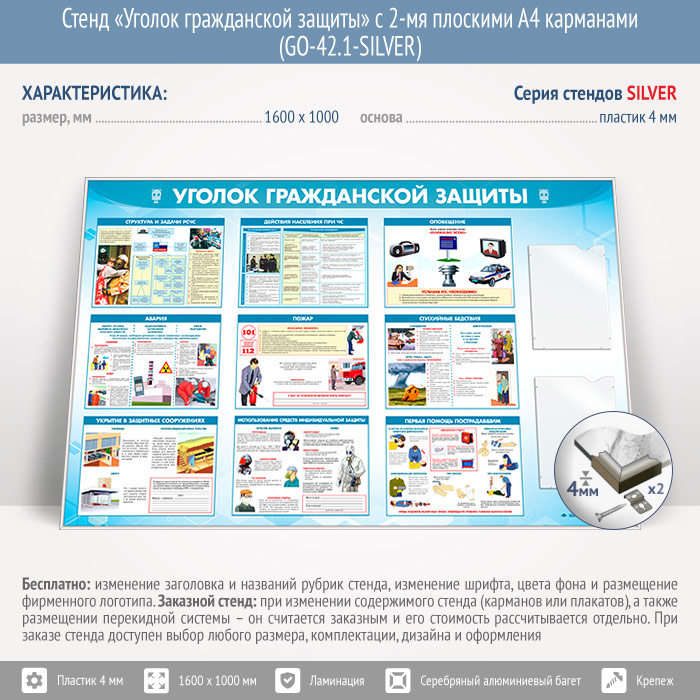 Стенд «Уголок гражданской защиты» с 2-мя плоскими А4 карманами (GO-42.1-SILVER)