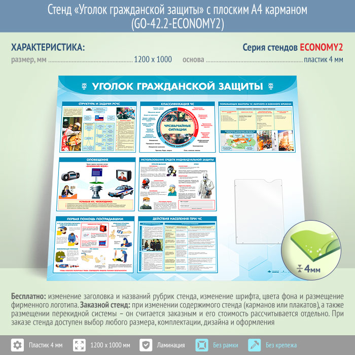 Стенд «Уголок гражданской защиты» с плоским А4 карманом - это важнейшая информация о необходимых действиях при возникновении чрезвычайных ситуаций
