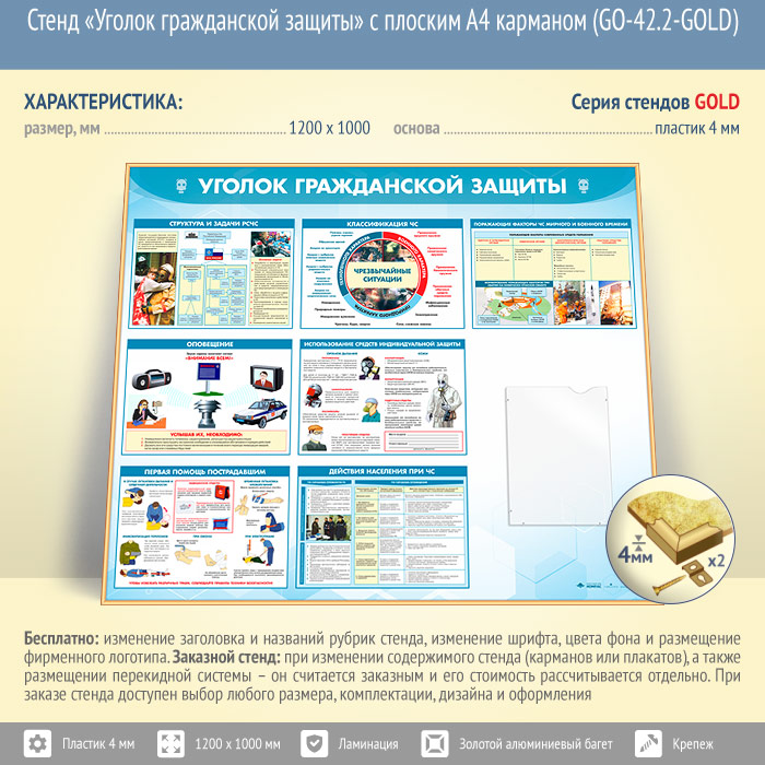 Стенд «Уголок гражданской защиты» с плоским А4 карманом (GO-42.2-GOLD)