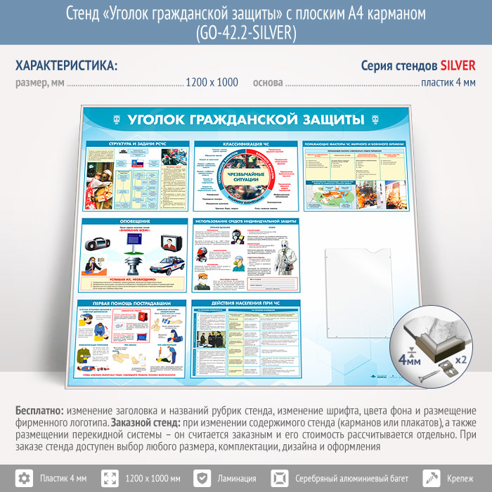 Стенд «Уголок гражданской защиты» с плоским А4 карманом (GO-42.2-SILVER)
