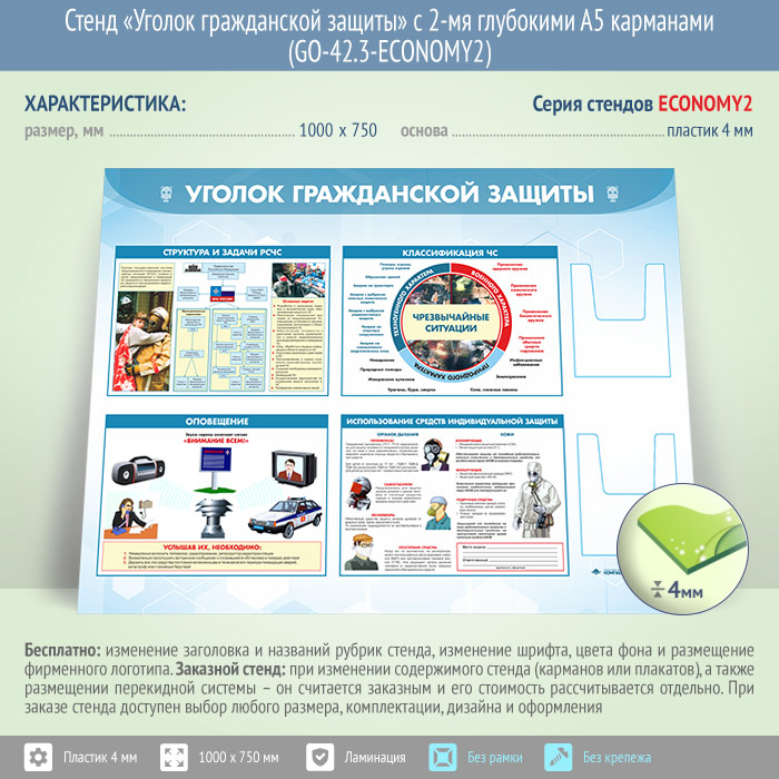 Стенд «Уголок гражданской защиты» с 2-мя глубокими А5 карманами - это важнейшая информация о необходимых действиях при возникновении чрезвычайных ситуаций