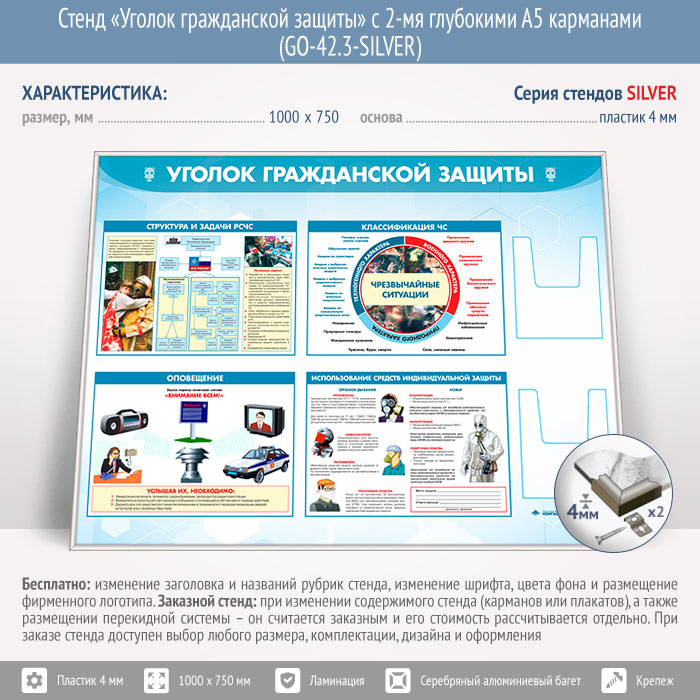 Стенд «Уголок гражданской защиты» с 2-мя глубокими А5 карманами (GO-42.3-SILVER)
