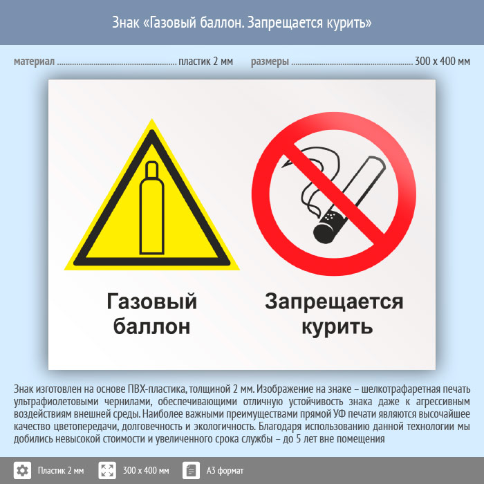 Знак «Газовый баллон. Запрещается курить», КЗ-18 на пластике, размером 400х300 мм обозначает место расположения баллонов с газом, а также предупреждает о вреде курения. Комбинированные знаки безопасности состоят из основных и дополнительных знаков с поясняющими надписями и предназначены для изложения комплексных требований, направленных на обеспечение безопасности