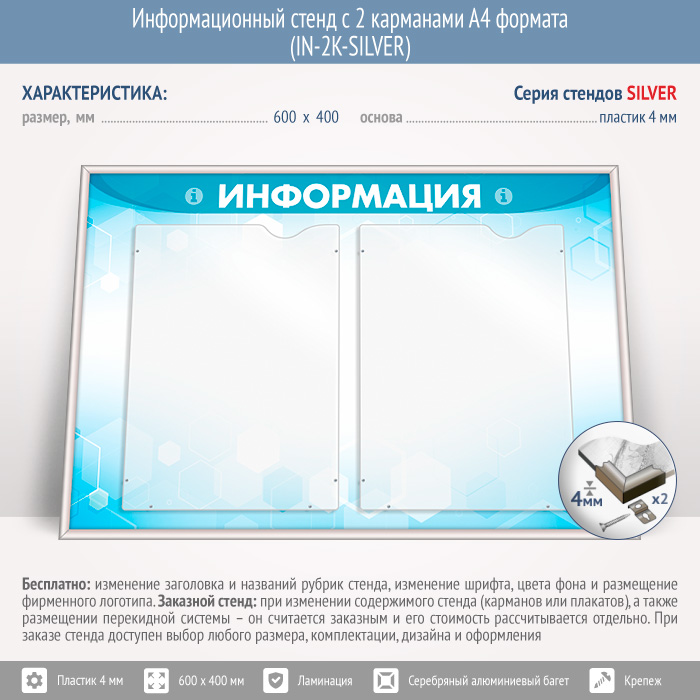 Информационный стенд с 2 карманами А4 формата (IN-2K-SILVER)