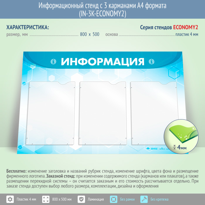 Информационный стенд с 3 карманами А4 формата предназначен для самостоятельного размещения информации – от документов, приказов и инструкций до рекламы... Часто на таких стендах размещают контактные данные, образцы заполняемых бланков, график работы, порядок приема документов в организации и прочее