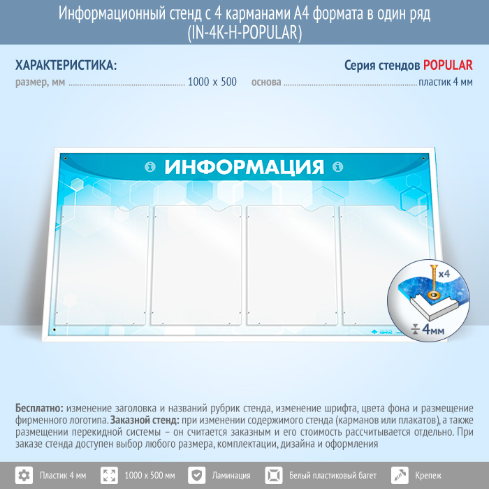 Информационный стенд с 4 карманами А4 формата в один ряд (IN-4K-H-POPULAR)