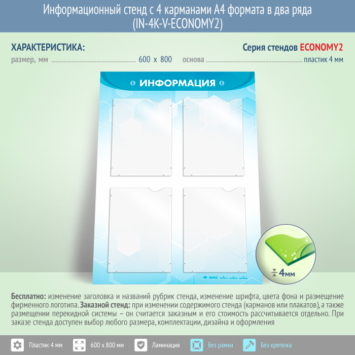 Информационный стенд с 4 карманами А4 формата в два ряда (IN-4K-V-ECONOMY2)