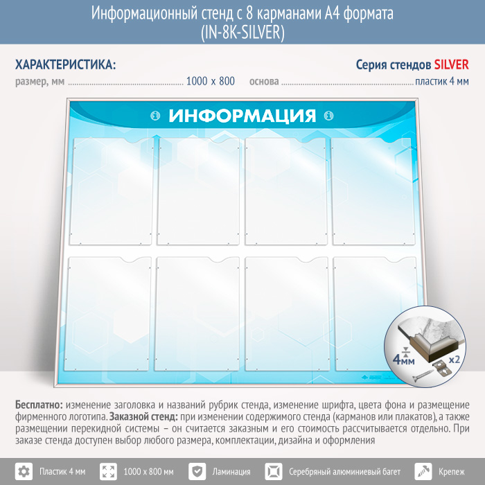 Информационный стенд с 8 карманами А4 формата (IN-8K-SILVER)