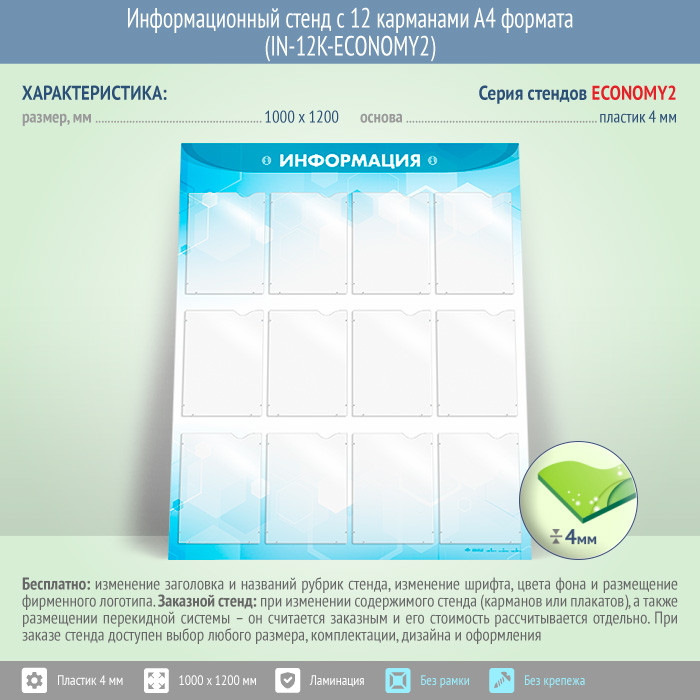 Информационный стенд с 12 карманами А4 формата предназначен для самостоятельного размещения информации – от документов, приказов и инструкций до рекламы... Часто на таких стендах размещают контактные данные, образцы заполняемых бланков, график работы, порядок приема документов в организации и прочее