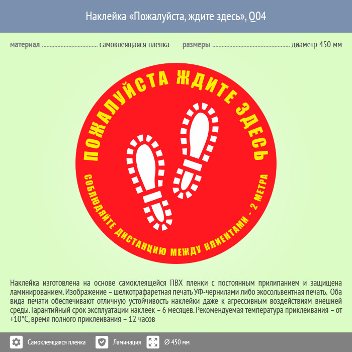 Наклейка на пол «Пожалуйста, ждите здесь», Q04 используется на время карантина для напоминания о необходимости соблюдения дистанции. Согласно постановлению главы Роспотребнадзора Анны Поповой от 1 апреля, все жители России должны соблюдать дистанцию и не подходить друг к другу ближе чем на один метр. В сообщении говорится, что ограничения не распространяются на поездки в легковых такси
