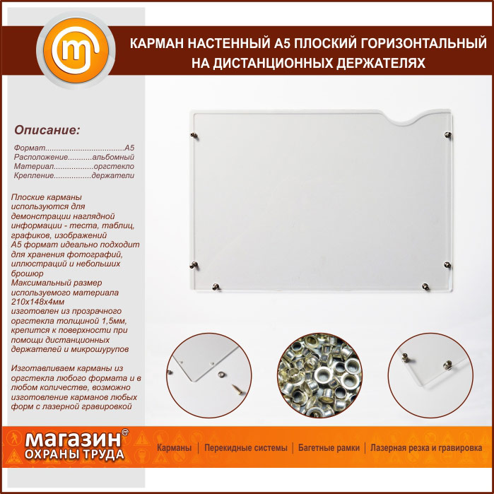 Предлагаем Вашему вниманию настенные плоские горизонтальные карманы формата A5 c 3-мя типами крепления – на двустороннем скотче, с бортиками и на дистанционных держателях