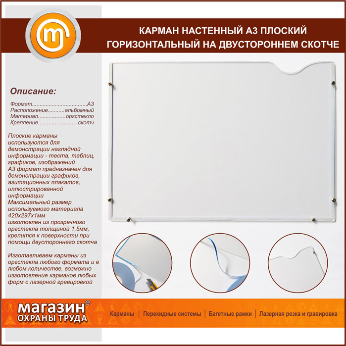 Карман настенный А3 плоский горизонтальный на двустороннем скотче