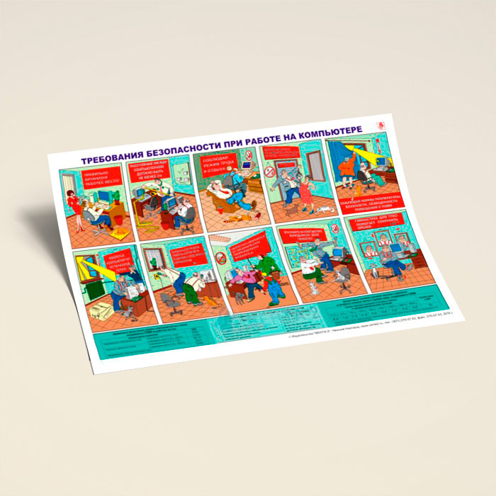 Плакат «Требования безопасности при эксплуатации персональных компьютеров» призывает сотрудников соблюдать правила охраны при работе с персональными компьютерами. Яркие веселые картинки улучшают психологический климат на рабочем месте