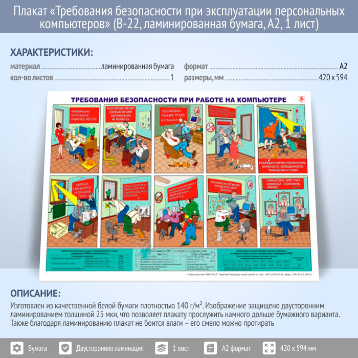 Плакат «Требования безопасности при эксплуатации персональных компьютеров» (В-22, ламинированная бумага, А2, 1 лист)
