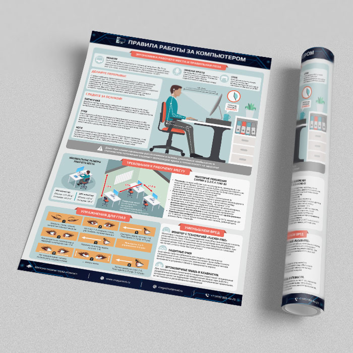 Плакат «Правила работы за компьютером» содержит свежую, актуальную информацию о правилах работы за ПК. При разработке плаката информация бралась не только из СанПиН 2.2.2/2.4.1340-03 "Гигиенические требования к персональным электронно-вычислительным машинам и организации работы", но и из международных источников. Из данного плаката вы узнаете о правильной позе, эргономике рабочего места, периодичности перерывов в работе, требованиях к рабочему месту согласно выше озвученному СанПиН, об упражнениях для снятия усталости глаз и о способах уменьшить вредное влияние от использования ПК