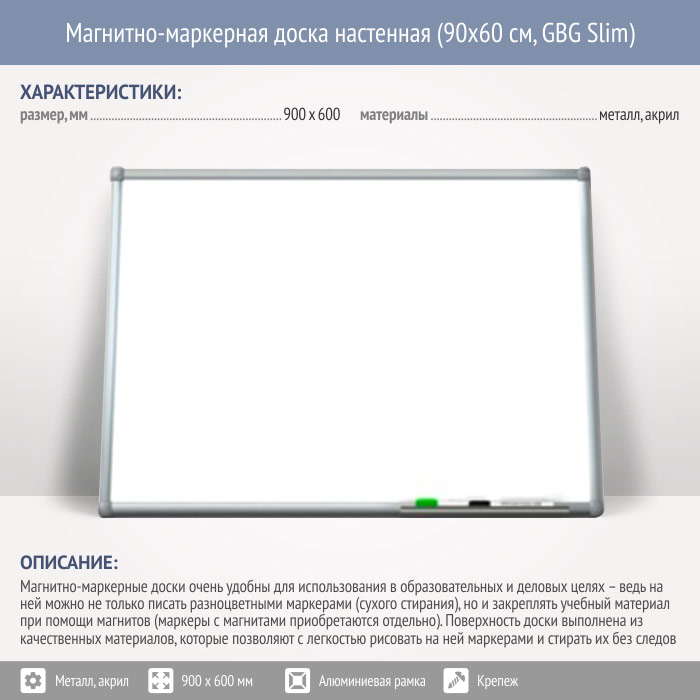 Магнитно-маркерная доска настенная (90x60 см, GBG Slim)