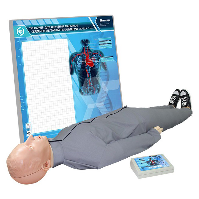 Тренажер-манекен имеет подвижное соединение тела с головой и оснащен анатомическими ориентирами, что делает его максимально схожим с человеком. Контроль проведения манипуляций осуществляется с помощью светозвукового сопровождения и системы датчиков, которая выводит результаты на табло и контроллер.