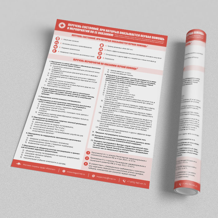 Плакат «Перечень состояний, при которых оказывается первая помощь и мероприятий по ее оказанию» разработан на основе Приказа Министерства здравоохранения и социального развития РФ от 4 мая 2012 г. N 477н «Об утверждении перечня состояний, при которых оказывается первая помощь, и перечня мероприятий по оказанию первой помощи»
