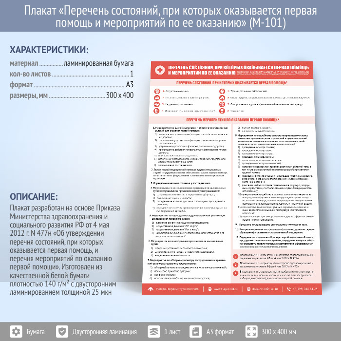 Плакат «Перечень состояний, при которых оказывается первая помощь и мероприятий по ее оказанию» (на основе Приказа от 04.05.2012 N 477н) (М-101, ламинированная бумага, А3, 1 лист)