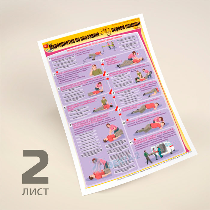 Комплект плакатов «Мероприятия по оказанию первой помощи» из 2 листов может быть изготовлен любого формата и размера, на бумаге, самоклеящейся пленке, пластике, баннерной ткани и металле. Разрабатываем, рисуем и изготавливаем плакаты на любую интересующую Вас тематику