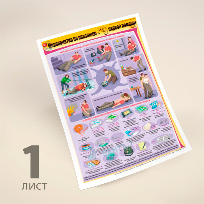 В комплекте плакатов из 2 листов «Мероприятия по оказанию первой помощи» описывается перечень состояний, при которых оказывается первая помощь, комплектация аптечки для оказания первой помощи, мероприятия по оказанию первой помощи