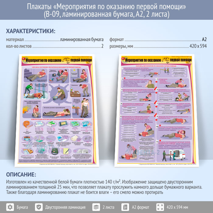 Плакаты «Мероприятия по оказанию первой помощи» (В-09, ламинированная бумага, А2, 2 листа)