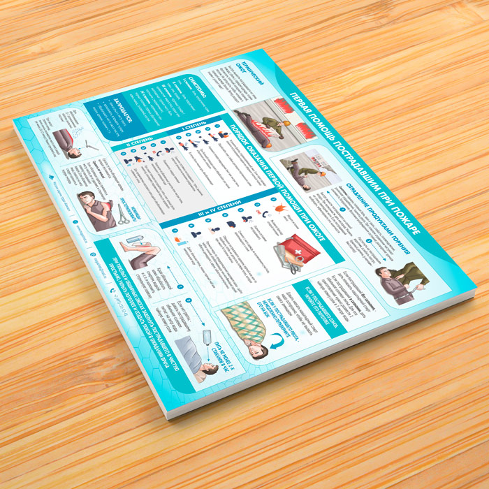 Также у нас Вы найдете буклет-памятку «Первая помощь пострадавшим при пожаре», которая содержит всю ту же информацию, что и плакат, но в более компакном виде. Такой буклет удобно взять с собой и ознакомиться с ним в удобное время и в удобном месте