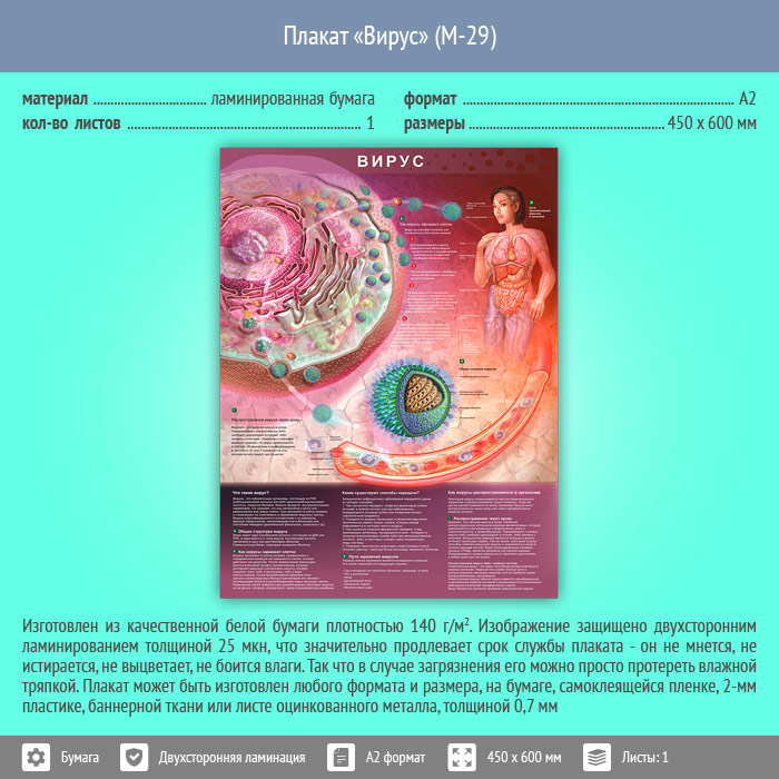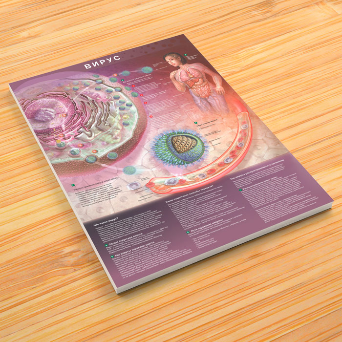 Плакат «Вирус» рассказывает о том, что такое вирус и какие органы он может поражать, о путях заражения и способах его передачи, об общей структуре вирусов и том, как они заражают клетки и распространяются в организме. Плакат имеет качественный дизайн и художественные иллюстрации