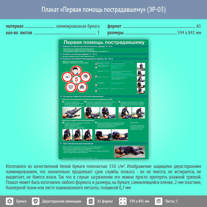 Плакат «Первая помощь пострадавшему» (ЭР-03, ламинированная бумага, А1, 1 лист)