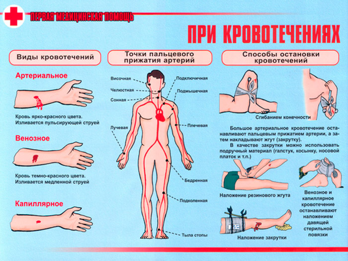 - Плакат «При кровотечениях» – Виды кровотечений, точки пальцевого прижатия артерий, способы остановки кровотечений
