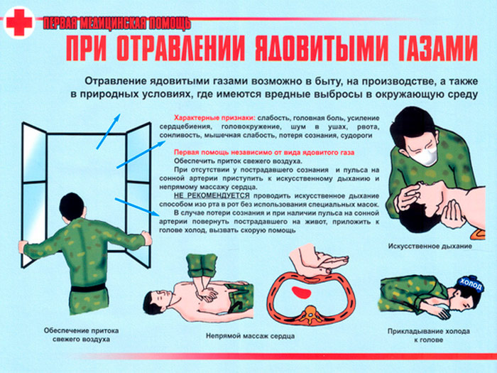 - Плакат «При отравлении ядовитыми газами» – признаки и первая неотложная помощь