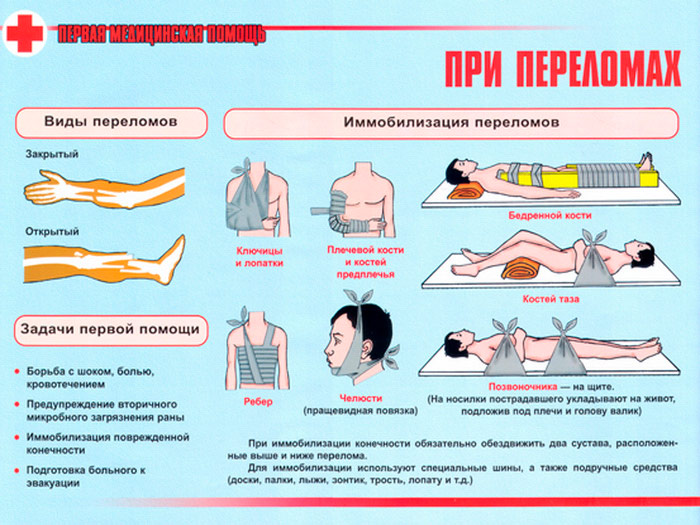 - Плакат «При переломах» – виды переломов, иммобилизация переломов, задачи первой помощи