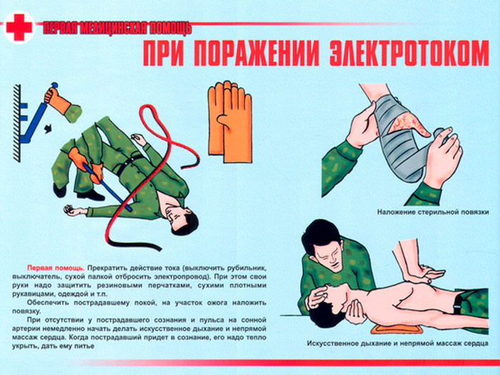 - Плакат «При поражении электротоком» – спасение, первая помощь и искусственное дыхание