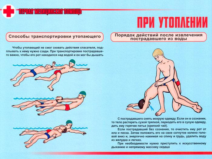 - Плакат «При утоплении» – способы транспортировки утопающего, порядок действия после извлечения пострадавшего из воды