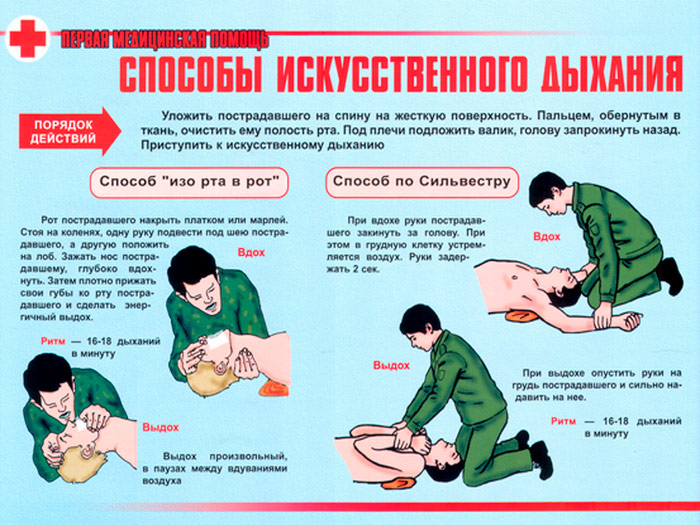 - Плакат «Способы искусственного дыхания» – порядок действий, способ изо рта в рот, способ по Сильвестру