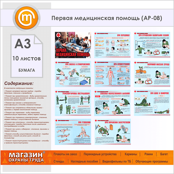 Плакаты «Первая медицинская помощь» (АР-08, бумага, А3, 10 листов)