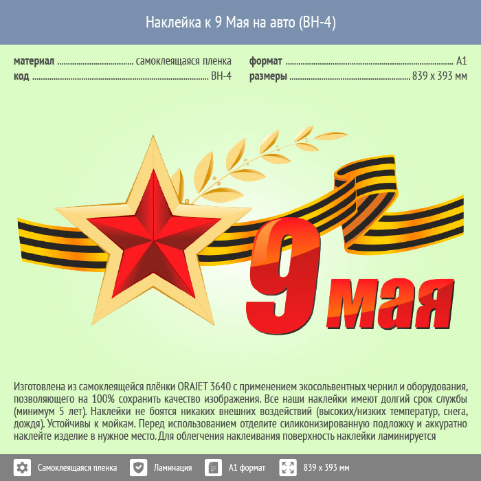 Наклейки к 9 Мая на авто (ВН-4) это замечательный способ выразить благодарность ветеранам ВОВ, знак памяти об их великом подвиге