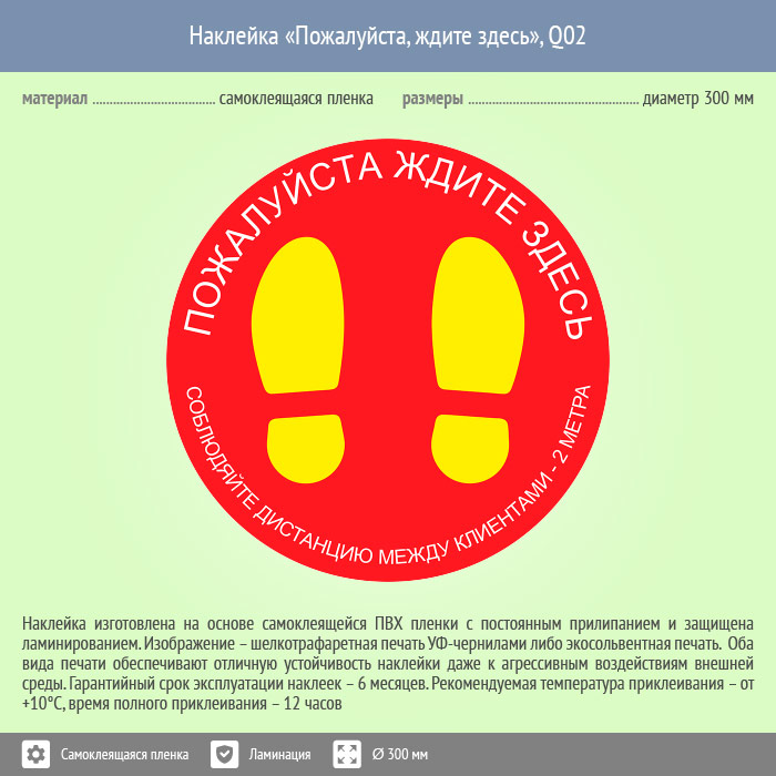 Наклейка на пол «Пожалуйста, ждите здесь», Q02 используется на время карантина для напоминания о необходимости соблюдения дистанции. Согласно постановлению главы Роспотребнадзора Анны Поповой от 1 апреля, все жители России должны соблюдать дистанцию и не подходить друг к другу ближе чем на один метр. В сообщении говорится, что ограничения не распространяются на поездки в легковых такси