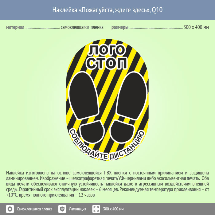Наклейка на пол «Пожалуйста, ждите здесь», Q10 используется на время карантина для напоминания о необходимости соблюдения дистанции. Согласно постановлению главы Роспотребнадзора Анны Поповой от 1 апреля, все жители России должны соблюдать дистанцию и не подходить друг к другу ближе чем на один метр. В сообщении говорится, что ограничения не распространяются на поездки в легковых такси