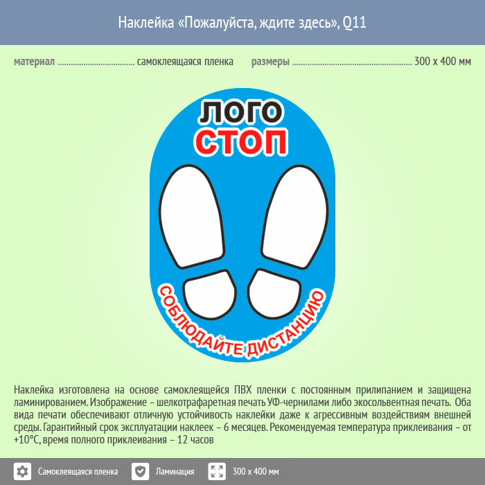 Наклейка на пол «Пожалуйста, ждите здесь», Q11 используется на время карантина для напоминания о необходимости соблюдения дистанции. Согласно постановлению главы Роспотребнадзора Анны Поповой от 1 апреля, все жители России должны соблюдать дистанцию и не подходить друг к другу ближе чем на один метр. В сообщении говорится, что ограничения не распространяются на поездки в легковых такси