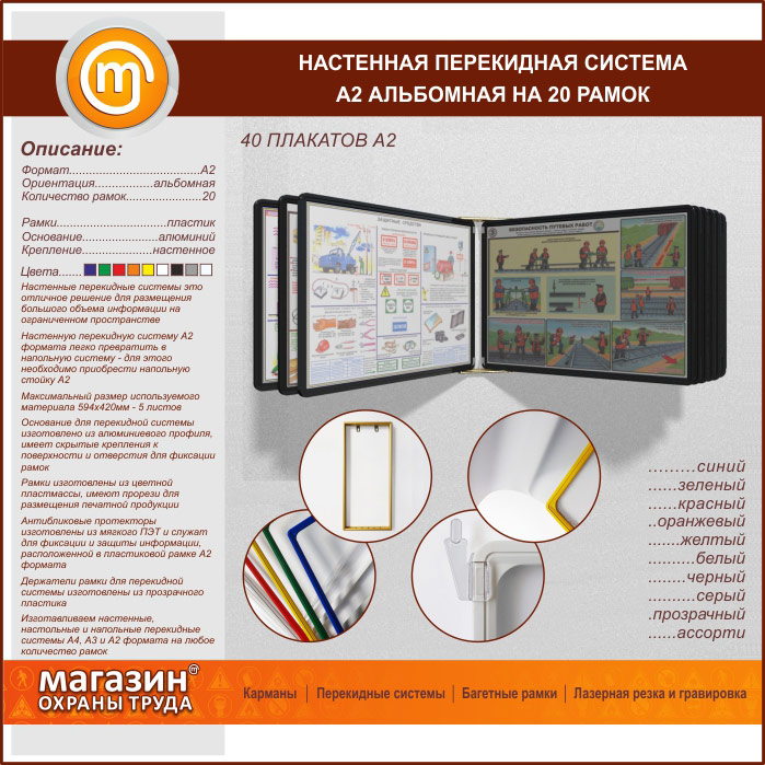 Настенные перекидные системы А2 формата на 20 рамок. Ориентация рамок - альбомная, книжная.