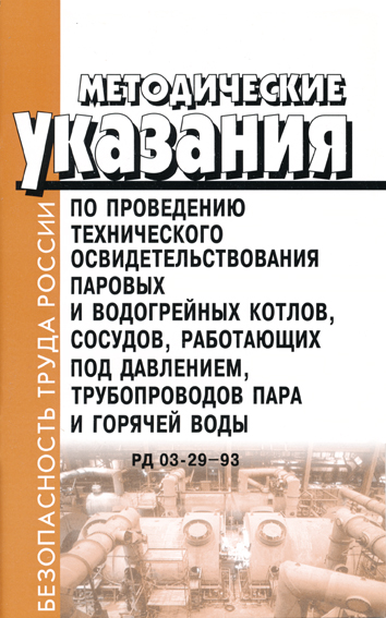 Источник публикации: «Промышленная безопасность при эксплуатации паровых и водогрейных котлов, сосудов, работающих под давлением, трубопроводов пара и горячей воды» (сборник документов), серия 10, выпуск 2, М., ГП «НТЦ по безопасности в промышленности Госгортехнадзора РФ», 2000.Название документа: «Методические указания по проведению технического освидетельствования паровых и водогрейных котлов, сосудов, работающих под давлением, трубопроводов пара и горячей воды. РД 03-29-93» (утв. Постановлением Госгортехнадзора РФ от 23.08.1993 № 30)
