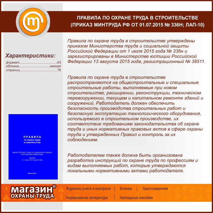 Правила по охране труда в строительстве утверждены приказом Министерства труда и социальной защиты Российской Федерации от 1 июля 2015 года № 336н и зарегистрированы в Министерстве юстиции Российской Федерации 13 августа 2015 года, регистрационный № 38511
