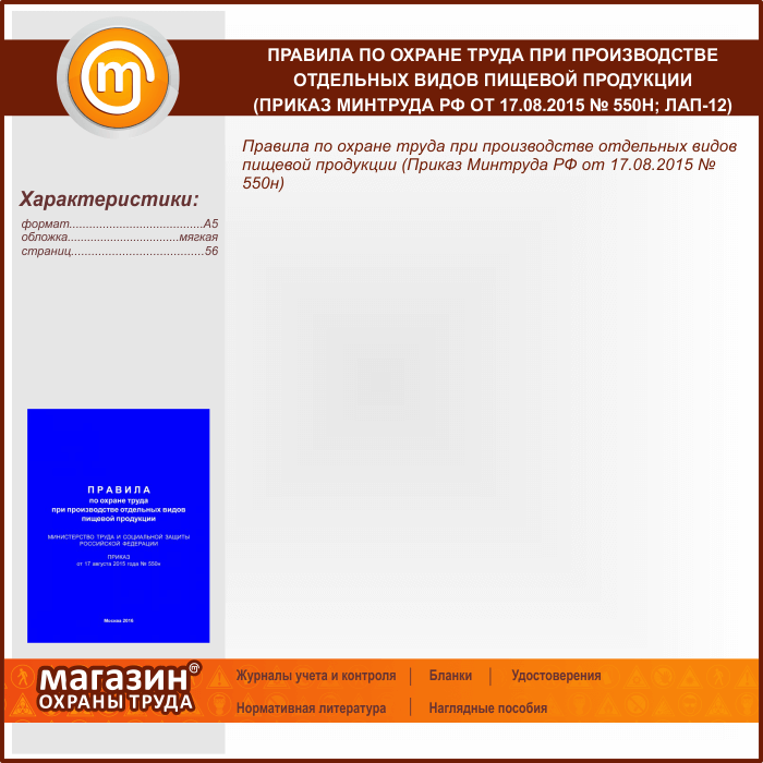 Правила по охране труда при производстве отдельных видов пищевой продукции (Приказ Минтруда РФ от 17.08.2015 № 550н) (ЛАП-12)