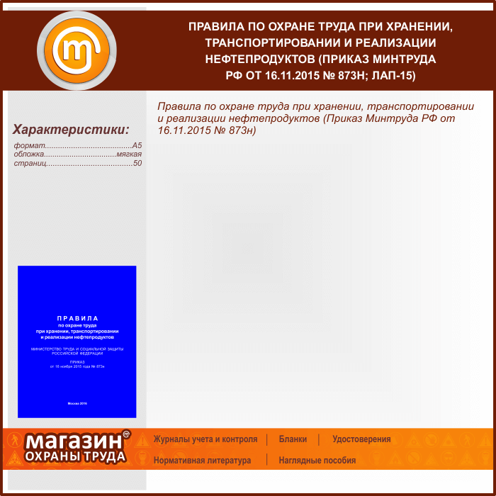 Правила по охране труда при хранении, транспортировании и реализации нефтепродуктов (Приказ Минтруда РФ от 16.11.2015 № 873н) (ЛАП-15)